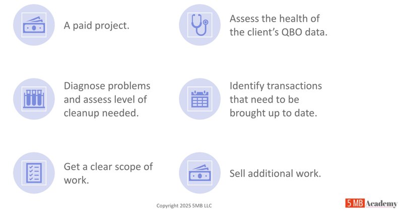A paid diagnostic review is a structured process where you assess a client’s books, identify the level of cleanup required, and determine a clear scope of work—all while getting paid for your expertise. Think of it as the bookkeeping equivalent of a doctor’s diagnosis. Instead of diving straight into cleanup, you evaluate the books at a transactional level to ensure accuracy and completeness.