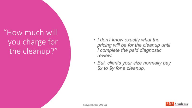 “Here’s what I recommend. I suggest starting with a paid diagnostic review of your books for $300. At the end of the review, I’ll go over my findings and provide fair pricing for the cleanup.”